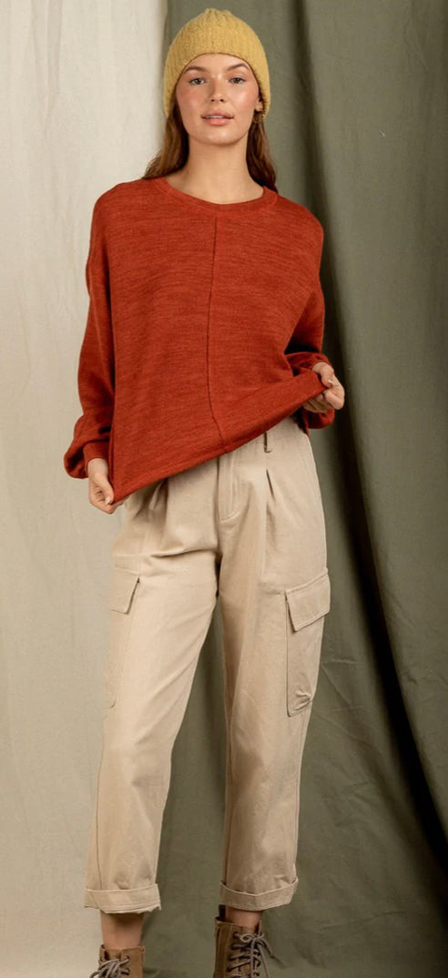 Rust balloon sleeve top- Long balloon sleeve- Round neck- Dropped shoulder